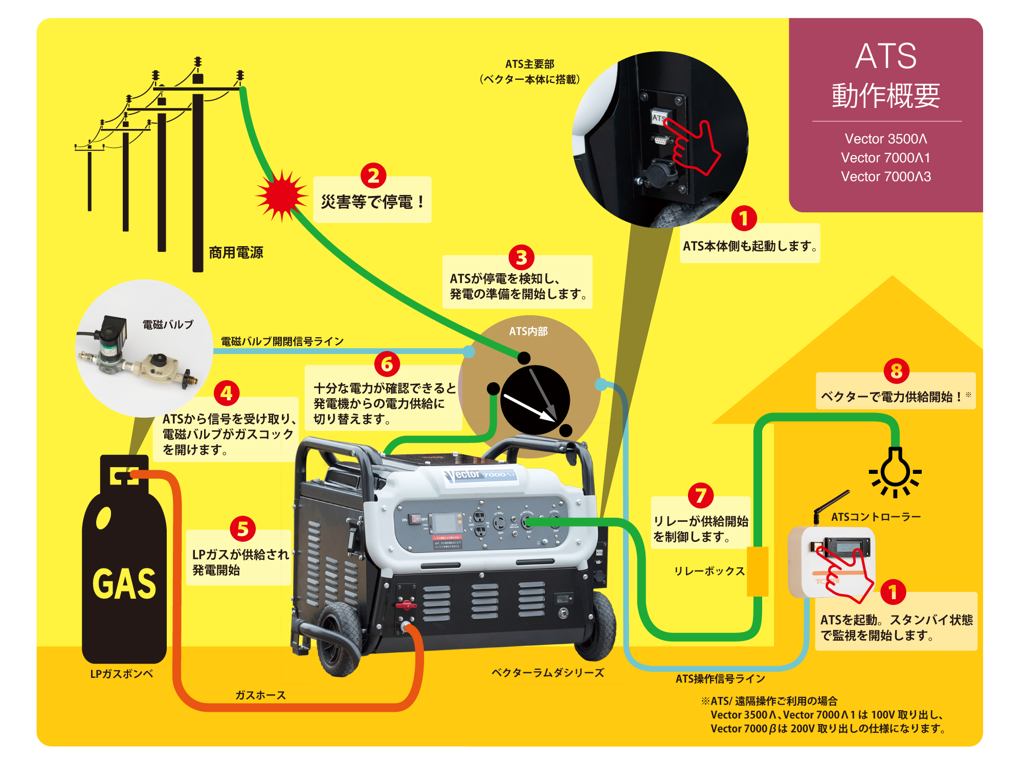 Vector Λ(ベクターラムダ)シリーズとして新たに搭載されたATSは、商用電源の電力供給状況を監視し、災害等で停電が起きた場合には、発電の一連の動作を自動で行い、非常用電源として停電から約30秒で電力の供給を開始します。商用電源が復旧した場合にも、供給状況を監視・確認し、こちらも自動で商用電源に切り替えます。