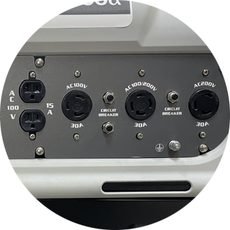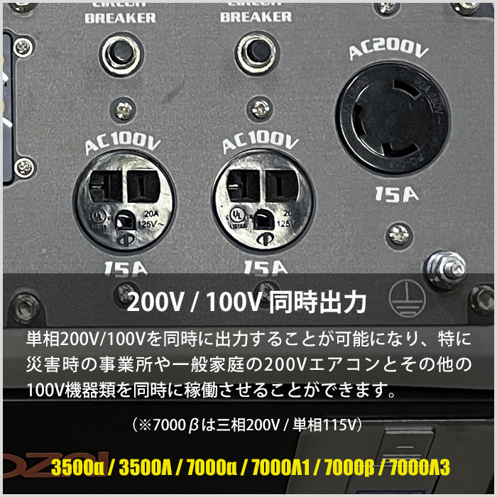 単相200V/100Vを同時に出力することが可能になり、特に災害時の事業所や一般家庭の200Vエアコンとその他の100V機器類を同時に稼働させることができます。