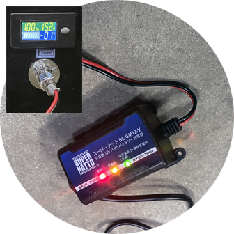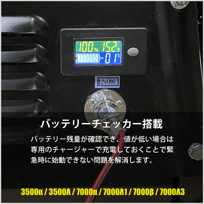 バッテリーの充電状況が確認でき、値が低い場合は専用のチャージャーで充電しておくことで緊急時に始動できない問題を解消します。