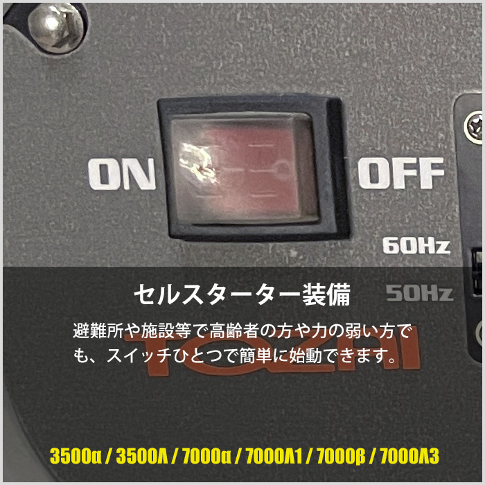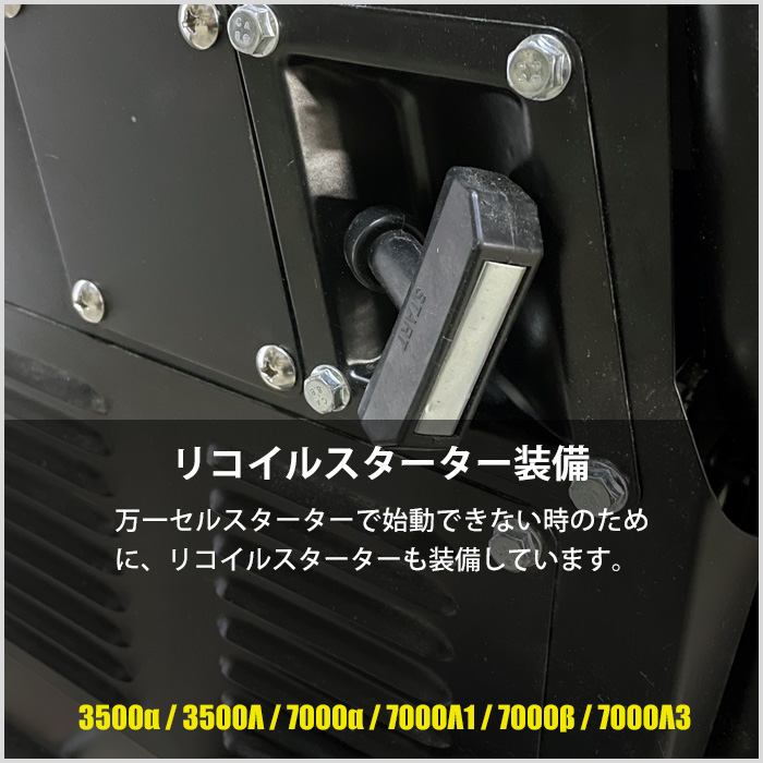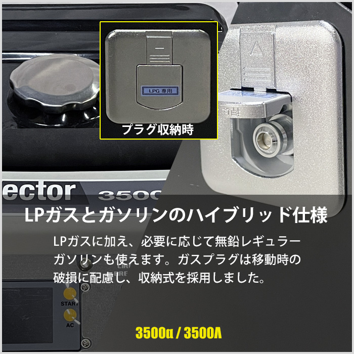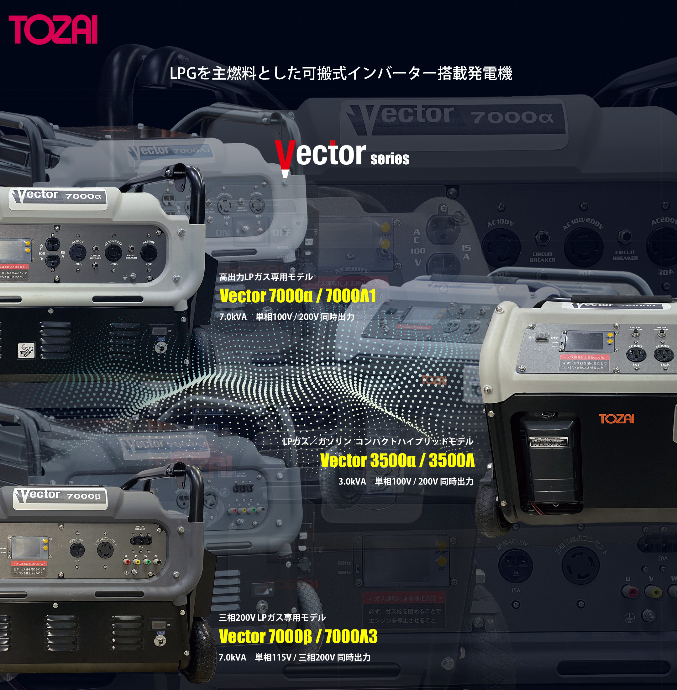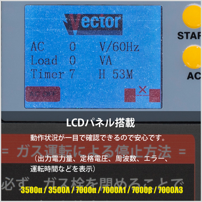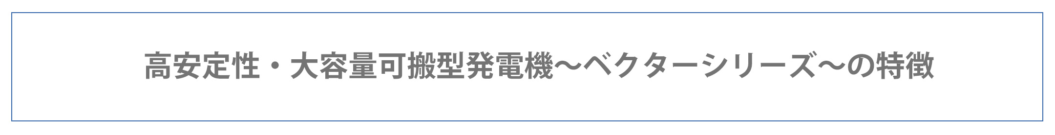 ベクターシリーズはいちばん小さな3500でも定格3.0kVA、7000は定格7.0kVAの出力容量を提供します。3500の容量の目安としては、一般的なファミリーマンションの契約電力30Aに相当します。 一般家庭の災害時バックアップ電源やBCP(事業継続計画)対策としてなど、目的に応じて選択、ご使用になれます。もちろん非常用としてだけでなく建築現場などでのプロユースとして、またはレジャーや催事などでも幅広くご活用ください。